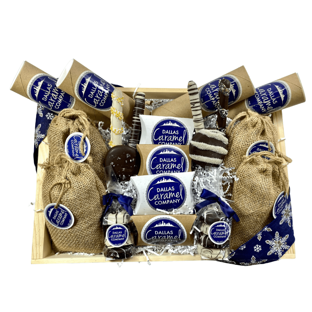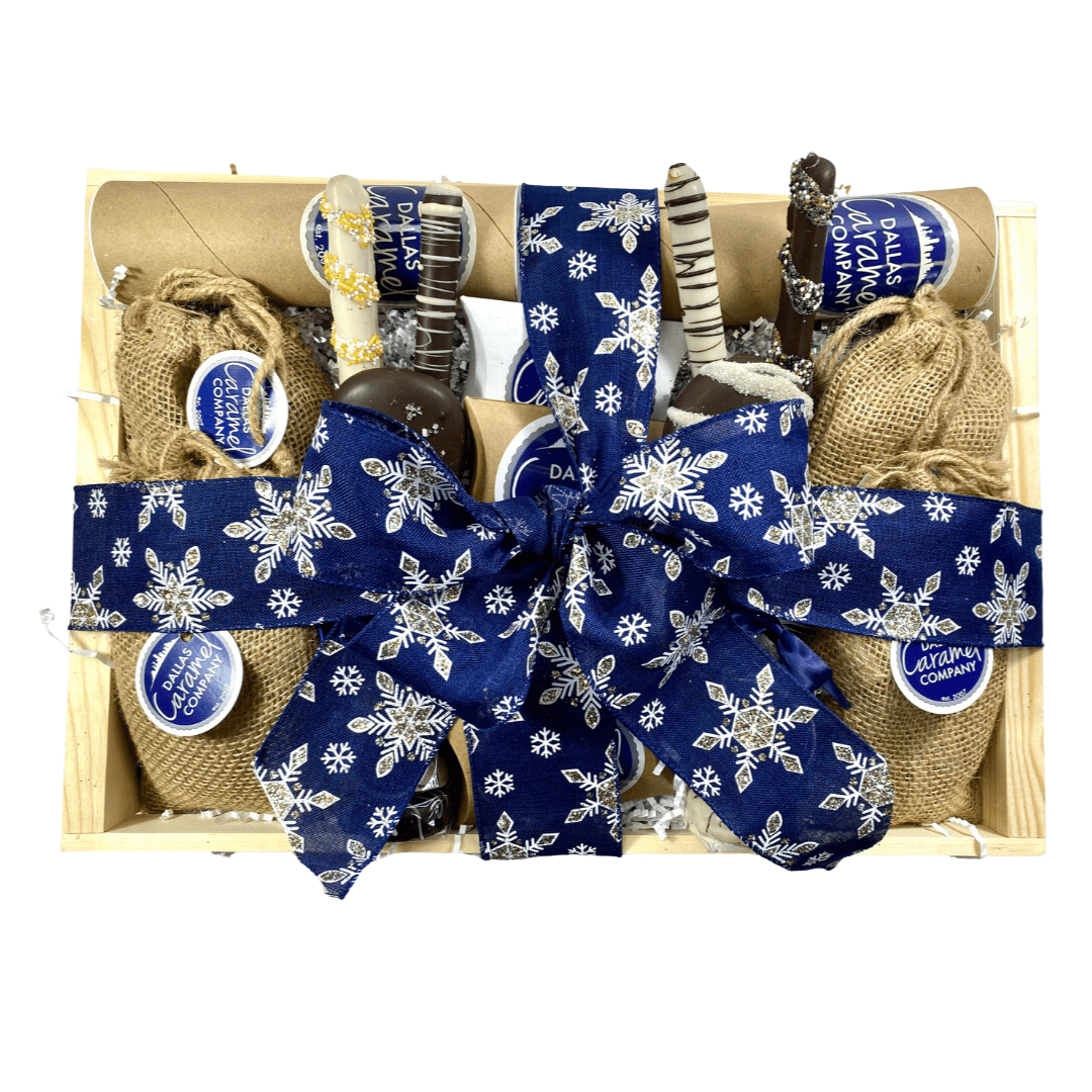 Each Gift Crate comes in a ready-to-ship wood crate, filled with silver and white crinkle paper, tied with a blue snowflake ribbon filled with delicious Dallas Caramel Company treats. It's a great way to get in the holiday spirit.